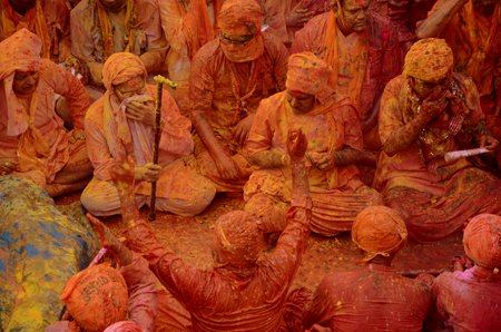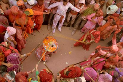 Today the famous lath mar Holi is celebrated in Barsana. Here, men from Nandgaon, the land of Krishna come to play Holi with the girls of Barsana and hope of raising their flag over ShriRadhikaji's temple. But, instead of colours they are greeted with sticks by the gopis. Hence, this Holi gets its name – LathmaarHoli. Smart enough, men come fully padded as they are fully aware what kind of welcome awaits them and also the fact that they are not allowed to retaliate on that day. In this mock battle of sorts, they try their best not to be captured. The unlucky one's however, are forcefully led away and get a good thrashing from the women.
